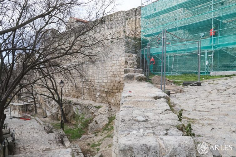 Des spécialistes ont procédé à un relevé du site par drone et à une étude archéologique réalisée par l’entreprise Mosaïques Archéologie. Sur l’échafaudage, les employés de l’entreprise Mastran d’Arles mènent des opérations de dévégétalisation, nettoyage, confortement, rejointement et patine. Le coût de cette 7e tranche s’élève à 385 000 euros, financés par l’État, la Région et la Ville. Celle-ci étudie la possibilité de créer un cheminement, accessible au public, sur le haut du rempart qui offre un magnifique panorama sur la tour Luma, l’abbaye de Montmajour, et même le Mont Ventoux.