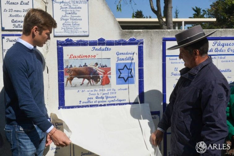 Au moment de prendre la parole, celui-ci avait une pensée pour son père, « dont les conseils et le soutien nous manque tant. Mais il serait fier de la feria qui nous attend, avec de grands toreros qu’on ne verra pas ailleurs (Morante de la Puebla, José Maria Manzanares, Diego Ventura), et un retour exceptionnel, celui de Chamaco, sans oublier un magnifique duel entre les Arlésiens Thomas Joubert et Andy Younes. » Ce dernier était présent pour dévoilé la plaque qui rappellera désormais au visiteur que le 2 avril 2018, il graciait le toro « Lastimoso » de l’élévage Jandilla dans les arènes de sa ville. A quelques mètres de là, huit toros de la même ganaderia faisaient l’admiration des aficionados. Ils sortiront en piste dimanche prochain.