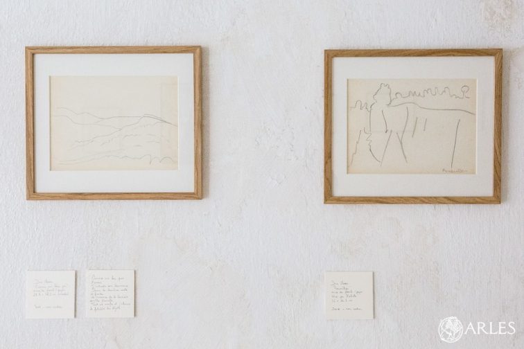 A la galerie La marchande des quatre saisons, sont exposés des dessins que Dora Maar croquait sur le vif autour de Ménerbes. Photographe au début de sa carrière, elle consacrala fin de sa vie à la peinture et au dessin, notamment après sa rencontre avec Picasso. Sous les dessins, des extraits de ses poèmes choisis par la galeriste Anne Carpentier. photo O. Quérette/ektadoc/ville d’Arles.