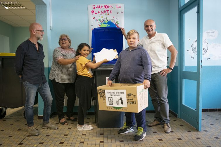 Sabrine et Raphaël ont été les premiers à se prêter au jeu. Un jeu avec un enjeu : l’environnement. Les deux élèves de l’école Henri Wallon de Barriol ont en effet inauguré le conteneur au couvercle bleu qui trône depuis ce vendredi 7 juin 2019 dans le hall de leur établissement. Les corbeilles à papier de toutes les classes y seront désormais vidées. Une initiative de l’agglomération ACCM en parfaite adéquation avec la volonté de l’élue déléguée à Barriol, Arielle Laugier, et de l’équipe pédagogique de l’école. « Notre projet d’école est basé sur l’éducation à la citoyenneté, et la sensibilisation à l’environnement en fait partie, insiste le directeur, André Delpomo. C’est important que les élèves comprennent que le produit ne disparaît pas une fois dans la poubelle, et que jeter n’est donc pas un geste banal : on peut en faire un geste intelligent ». Sous l’impulsion de Nathalie Descamps, institutrice dans l’établissement, les élèves de l’école de Barriol s’étaient déjà distingués le 15 mars dernier en remplissant 12 sacs de déchets ramassés dans le quartier. Mais le tri du papier ne s’arrêtera pas à la porte de leur établissement : les 41 autres écoles primaires que compte la ville d’Arles seront équipées d’un conteneur bleu d’ici la fin de l’année scolaire.