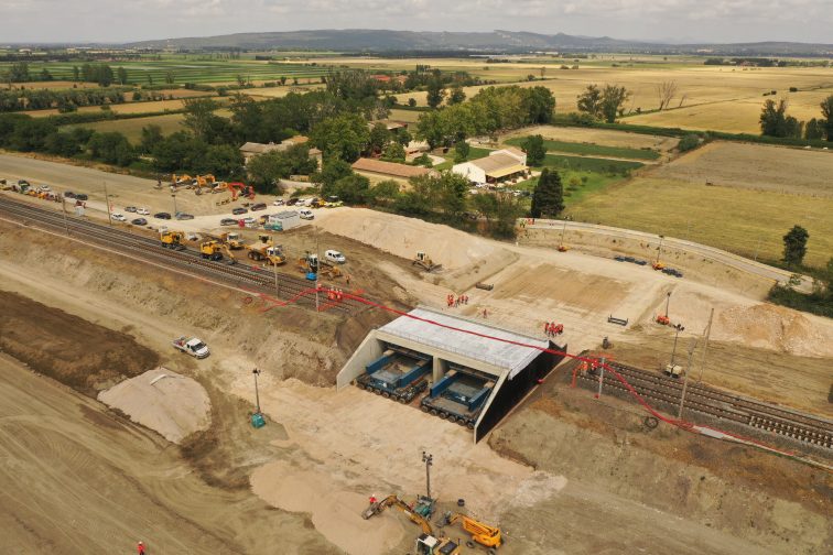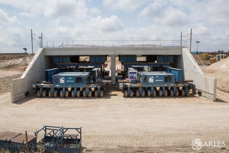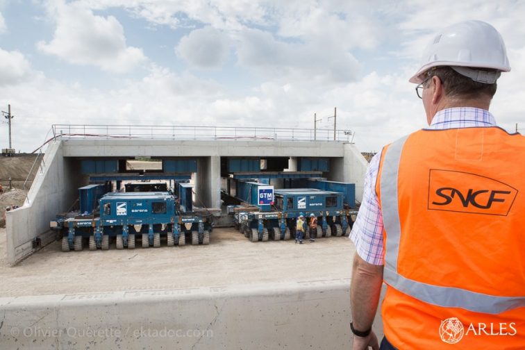 Avec ses 6 mètres de haut, 25 mètres de large et son poids de 1700 tonnes, difficile d’imaginer qu’un tel mastodonte puisse être déplacé -encore moins qu’il puisse être positionné au centimètre près. C’est pourtant ce que les hommes de SNCF Réseau ont réussi, à deux reprises, les 14 et 15 juin 2019. Deux ouvrages d’art, dits ponts cadres, ont été positionnés pour soutenir la voie ferrée reliant Arles-Tarascon, au nord d’Arles (à la hauteur de la manade Mogador). Les ouvrages ont été construits à quelques mètres de leur emplacement définitif puis soulevés d’une dizaine de centimètres et déplacés par un engin tout aussi gigantesque, muni de 192 roues, pour être placés sous la voie ferrée. Une opération qui a nécessité la présence d’une centaine d’hommes, mobilisés pour refaire le terrassement afin que le pont ne s’enfonce à terme, retirer les rails et dégager 5000 m3 de terre pour créer les brèches dans le remblai, avant le ripage du pont. « Ce qui est très rare, c’est que nous ayons à placer 10 constructions de ce type – cinq en 2019 et les cinq derniers en 2020″, précise Jacques Frossard, directeur régional territorial de SNCF Réseau pour la région Sud. Le coût des travaux est lui aussi conséquent : 70 millions d’euros, subventionnés par l’Etat à hauteur de 6 millions d’euros, le reste étant pris sur les fonds propres de l’entreprise SNCF Réseau.