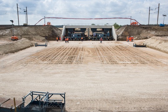 Les vérins hydrauliques, munis de 192 roues, prêts à entrer en action pour effectuer le ripage des ouvrages SNCF du remblai ferroviaire Tarascon-Arles. photo O. Quérette/ektadoc/ville d’Arles.