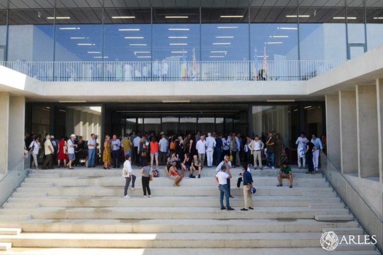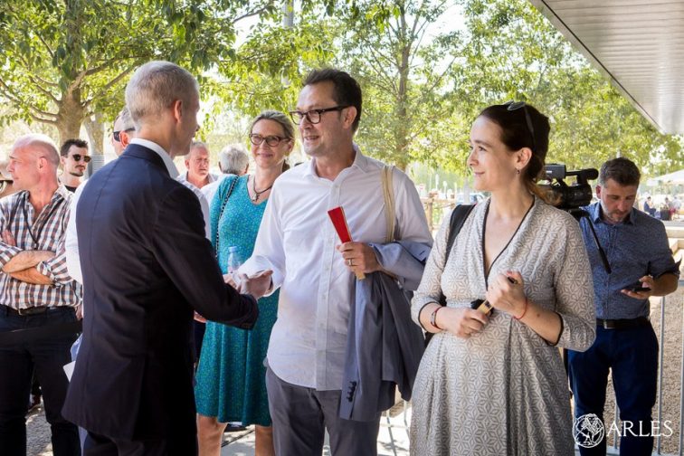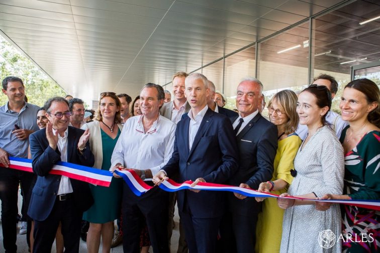 Le ministre de la Culture, Franck Riester, a coupé le ruban bleu-blanc-rouge dans l’entrée spectaculaire du nouveau bâtiment de l’Ecole nationale supérieure de la photographie, le 1er juillet 2019. Pour accomplir ce geste symbolique, il était entouré de tous ceux qui, au fil des ans, ont accompagné le développement de l’Ecole, la plus importante en Europe pour l’enseignement de la photo. Jack Lang était ministre de la Culture en 1982 quand avec François Mitterrand, il a été décidé de créer une école nationale dans la ville qui célébrait déjà la photo à travers le festival les Rencontres d’Arles et au musée Réattu, grâce à Lucien Clergue et Jean-Maurice Rouquette. Etaient également présentes, Aurélie Filippetti qui en juillet 2012, approuvait, en tant que ministre de la Culture, le projet d’un nouveau bâtiment pour l’Ecole, et Françoise Nyssen, qui occupait la fonction alors que les travaux étaient en cours. A leurs côtés, l’ancien président de la région Sud-Provence-Alpes-Côte d’Azur Michel Vauzelle, et son successeur, Renaud Muselier, tout deux très investis puisque la Région a contribué à hauteur de 5 millions d’euros au financement du chantier. Et enfin, le président de la communauté d’agglomération Arles-Crau-Camargue-Montagnette, Claude Vulpian, et le maire d’Arles, Hervé Schiavetti, tous deux également investis dans le nouveau projet*. Le ministre de la Culture a fait remarquer que « l’ENSP était un très bel exemple de la volonté collective qui existe en France, au-delà des appartenances politiques, de se mobiliser pour la culture« .