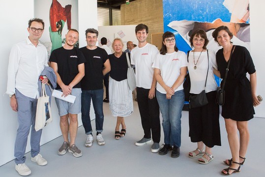 Agnès b. (au centre) avec les étudiants qui ont travaillé sur l’exposition Modernité des passions et Rémy Fenzy, directeur de l’Ecole à qui succède aujourd’hui Marta Gilli (2ème à partir de la droite). photo O. Quérette/ektadoc/ville d’Arles.