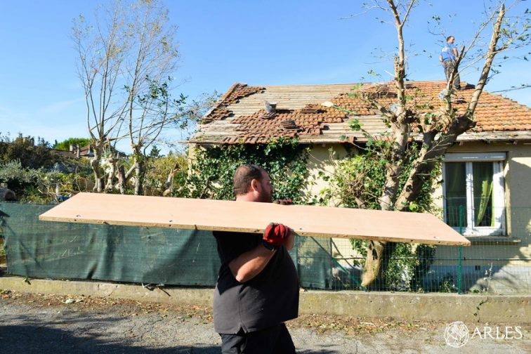 Une riveraine arrive les bras chargés de vêtements, qui trouveront très vite preneur. « La tornade est passée à 100 mètres de ma maison. Ça aurait pu être moi, donc la moindre des choses, c’est d’être là » dit-elle. « On se sent impuissants chez nous, alors on est venus pour se rendre utile » enchaîne une jeune femme arrivant de Raphèle avec son père et une amie. Quelques minutes plus tard, le trio est déjà à l’œuvre chez Denise, une retraitée touchée par la tornade dans le lotissement de Vert village. Sa toiture a été endommagée, son jardin dévasté. « Je me sentais seule, un peu désemparée. Voir arriver des personnes qui viennent m’aider gratuitement alors que je ne connais même pas, ça fait chaud au cœur » témoigne-t-elle. Même émotion pour Magali, assistante maternelle dont la maison – qui est aussi le lieu de travail – a été durement frappée par la tornade. Pour elle, comme pour toutes les sinistrées, le coiffeur du quartier offre un brushing, pendant que le Secours populaire ouvre un compte bancaire spécial pour recevoir les dons pour Pont-de-Crau, et que des parents d’élèves préparent une collecte de jouets et de fournitures scolaires pour les enfants qui ont tout perdu.