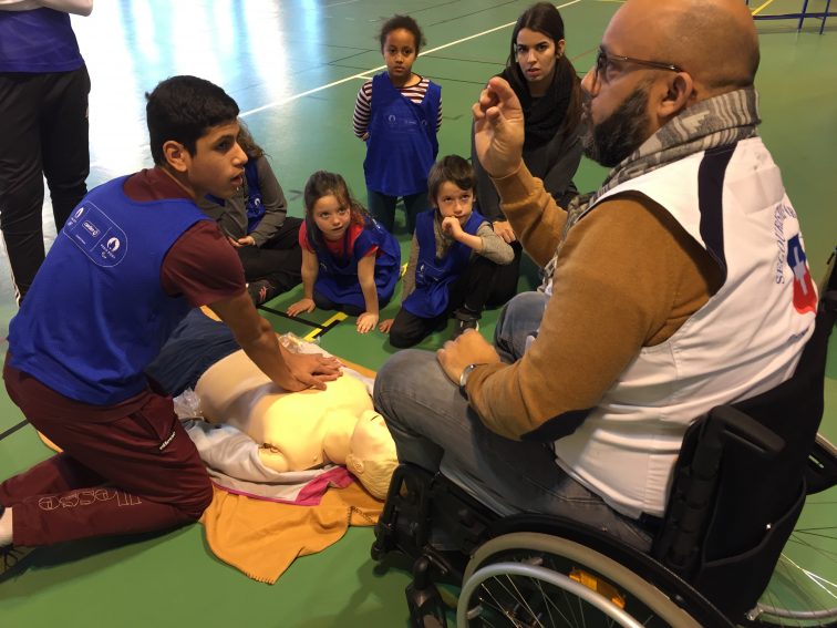 Ballon à grelots et masques sur les yeux, les élèves se sont notamment essayé au cecifoot, discipline paralympique. L’après-midi, plus question de sport, mais de mise en situation via des ateliers découverte du braille, peinture sans bras et gestes de la vie quotidienne (débarrasser, s’habiller…). Deux handi-secouristes étaient également présents pour apprendre aux élèves les gestes qui sauvent, et leur rappeler que les personnes en situation de handicap peuvent elles aussi – depuis 2017 – obtenir leur diplôme de secouristes. « Le principe est simple: je sais, tu fais, nous sauvons » répond Nasredine Oulhaci, formateur Croix Blanche, à un élève lui demandant comment il pouvait porter secours à quelqu’un depuis son fauteuil roulant. « Si on est diplômé, c’est qu’on est capable, on est handi-capable » insiste-t-il.