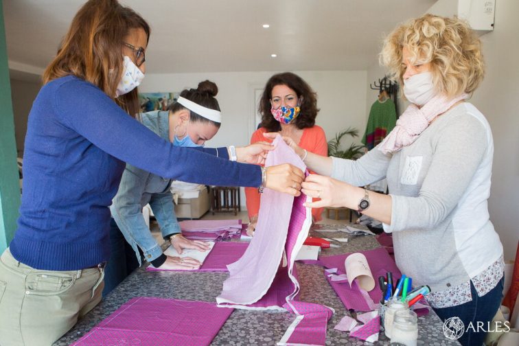 Autour de la grande table, elles sont quatre à s’affairer. Plier les coupons de tissu, le découper en petits rectangles, les répartir en différentes piles. Et puis ranger, gérer les livraisons, réceptionner la matière première. Maryline Laville est enseignante au lycée Montmajour dans la section métiers de la mode, Laure Ripert-Grimaldi, auxiliaire de vie scolaire, Chérazade Kadour, enseignante dans un collège et Nadia Chebil a créé la première structure familiale d’accueil de jour familial pour des personnes atteintes de la maladie d’Alzheimer, Les Papillons de Marcelle. C’est dans son salon qu’elle a mis en place, depuis plus de trois semaines, cet atelier de confection, berceau du réseau Nos soignants dans de beaux draps.