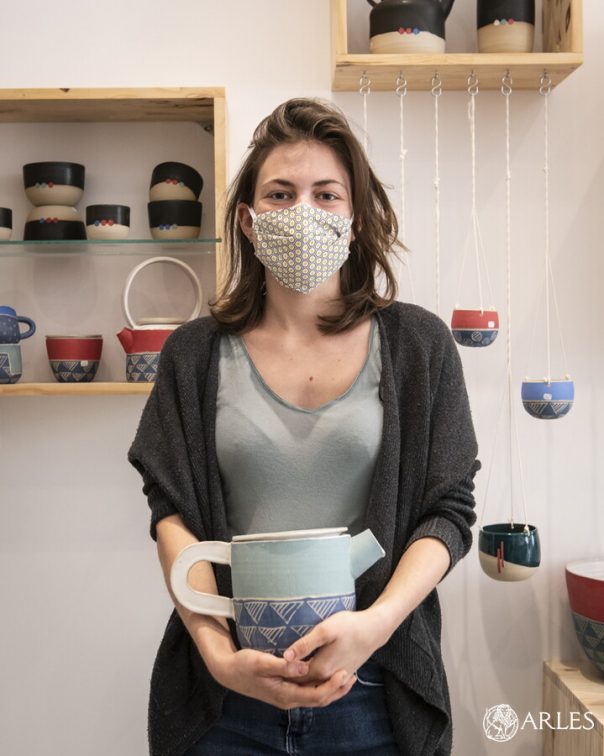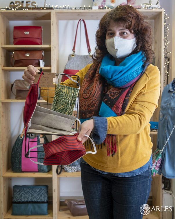 Un peu plus loin, « L’atelier des créateurs » qui réunit trois créatrices est prêt à accueillir les badauds et la clientèle fidèle. Natalie Sukhova tient la boutique le matin. Invitée à rejoindre l’atelier depuis un an, ses créations semblent relever de la magie : sous ses mains, le papier se fait dentelle, paysage, carte et boîte en 3D. Aux côtés de Lydia Pensotti, qui conçoit des sacs, des broderies et de Sabine Laugier, qui confectionne robes, étoles, plaids à partir de tissus indiens, Natalie est ravie de retrouver sa clientèle. « Durant le confinement nous avons réactivé nos réseaux sociaux pour rester en communication et permettre aux Arlésiens d’acheter des produits en ligne » détaille Natalie. Depuis que l’atelier a rouvert, beaucoup sont venus acheter les masques confectionnés par Lydia aux normes AFNOR. Ici la règle est la même, lavage de mains obligatoire et port du masque recommandé, « nous faisons entrer que deux ou trois personnes, pas plus » insiste cette amoureuse du papier.