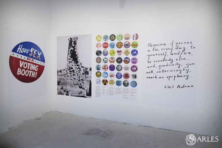 Sur les murs de ce bâtiment à peine fini, s’affichent donc les oeuvres de Sophie Calle, Etel Adnan, Annette Messager, Maryse Condé, Stephen Shore, Olafur Eliasson, Norman Foster, Judy Chicago, David Lynch … Jeunes ou moins jeunes, en devenir ou piliers de la création contemporaine mondiale. Photos, dessins, collages, textes… Chacun a choisi son mode d’expression pour exprimer l’une des inquiétudes qui secouent le monde : le racisme, l’état de la planète, l’égalité, le rapport au corps… Mais chaque poster constitue aussi une histoire à lui tout seul, un moment dans la vie de l’artiste, un écho à son propre cheminement.