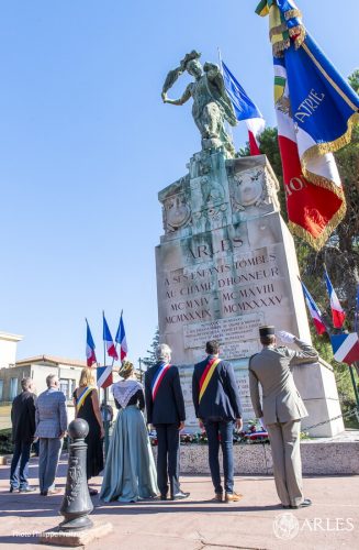 Le maire d’Arles, accompagné de la Reine d’Arles, Naïs Lesbros, devant la stèle en hommage aux combattants de la libération d’Arles. photo P. Praliaud/ville d’Arles.