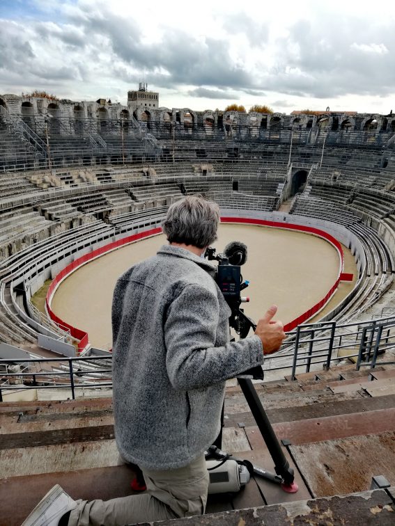 Habitué du Festival « Les Suds à Arles », le jeune réalisateur Giulio Callegari n’imaginait pas un autre décor que celui d’Arles pour son court-métrage intitulé Erratum. « Venir ici était une évidence pour tourner cette comédie sur l’archéologie, car les plus beaux monuments et les plus beaux vestiges de France sont à Arles. Pour ne rien gâcher, on a bénéficié d’une météo extraordinaire. Cette lumière, ces vieilles pierres et ces rues vides à cause du confinement : tout cela a quelque chose de fascinant. Je remercie la Ville de nous avoir ouvert ses portes, ça dépasse toutes mes espérances » s’émerveille Giulio Callegari. Le pitch de ce film de 20 minutes destiné à Canal+ ? C’est l’histoire d’une archéologue qui découvre sur une fresque de l’Antiquité une insulte totalement anachronique. Le tournage est passé par la nécropole des Alyscamps, les marches des arènes, l’amphithéâtre de l’antenne universitaire et enfin au Musé départemental Arles antique.