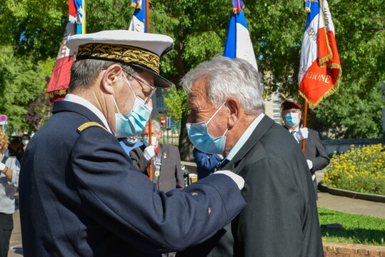 Autre moment chargé d’émotions après l’hommage aux Anciens Combattants: la remise des insignes de Chevalier dans l’ordre national du mérite, remise à René Trouchaud par le Général Pierre Velly.
