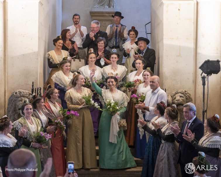 Visage évoquant les belles du XIXe siècle, sourire radieux qui éclaire les traits fins, la jeune femme, passionnée de linguistique qu’elle étudie et de langue provençale, a été ensuite accueillie dans la salle des pas perdus par la foule des invités. A ses côtés, Naïs Lesbros dans un costume signé de Christian Lacroix, était elle-aussi émue en souhaitant un magnifique mandat à celles qui lui succèdent : Manon Alexandre, Marie Cholvy, Clémence Fabre, Amandine Valérian et Pauline Valette, auxquelles Camille Hoteman a promis un « règne en équipe, avec toutes ».