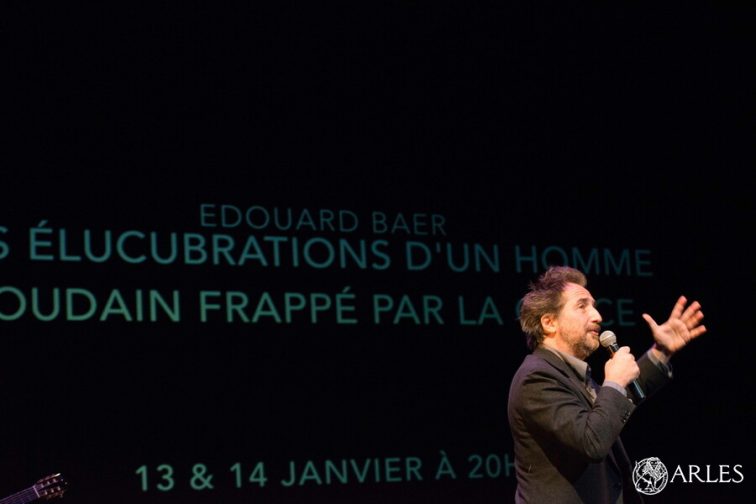 « Ca me touche d’être ici avec vous ce soir, moi qui ai commencé ma vie à Arles au bar chez Virgile« . Edouard Baer, nommé artiste associé en charge de la programmation du théâtre d’Arles, a donné le ton de la soirée, et sans doute de l’esprit qui animera désormais le théâtre, dès les premiers mots de la présentation de la saison 2021-2022, le 8 novembre. Rien à voir avec l’exercice conventionnel et souvent ampoulé de ce genre de soirée. On était hier soir au spectacle, au vrai, avec du rire, notamment grâce aux interventions du comédien Arnaud Aymar, des surprises – une conversation surréaliste au téléphone entre Edouard Baer et Alexandre Astier, qui viendra en juin – et un final bouleversant, quand l’acteur a dit quelques phrases du dernier livre de Romain Gary. Et surtout, l’amour du théâtre, du plaisir de rire ou de pleurer, devant un texte et des acteurs.