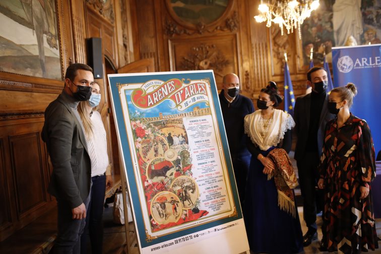 De gauche à droite autour de l’affiche de la feria de Pâques 2022 : Jean-Baptiste et Lola Jalabert, Jean-Michel Jalabert, Camille Hoteman, Emmanuel Lescot et Mandy Graillon. Photo Florent Gardin / Ville d’Arles