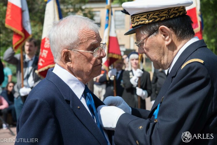 C’est ensuite un « héros discret » qui a été honoré : René Goudet, militaire dans l’Armée de l’air, a reçu les insignes de chevalier de la Légion d’honneur des mains du général Pierre Velly. Plus tard, le maire d’Arles, Patrick de Carolis, lui a également remis la médaille de la Ville, en précisant que c’était « une décoration bien modeste mais décernée à ceux qui honorent notre ville« , en dressant le portrait de René Goudet, qui a participé au soutien du camp de Dien Bien Phu, en Indochine, et a effectué 384 missions de guerre en 70 heures de vol. Puis, Georges Carlevan, ancien directeur de l’école de Raphèle, promoteur du Musée de la Résistance en pays d’Arles et Jean-Pierre Beau, président du Comité départemental des Bouches-du-Rhône du Concours National de la Résistance et de la Déportation, tous deux très actifs pour faire vivre le devoir de mémoire, ont été distingués et reçus la médaille de la Paix.