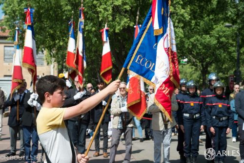 Les cérémonies se sont succédés tout au long de la journée dans les villages d’Arles, mais c’est devant le monument aux morts du boulevard des Lices que jeunes et moins jeunes se sont rassemblés. Là , les élèves de l’école Henri-Wallon ont chanté la Marseillaise, le jeune Paulin, représentant les écoliers de l’école du Sambuc, a reçu le drapeau du Comité d’Arles du Souvenir Français, et trois jeunes bénévoles, qui portent régulièrement le drapeau du Comité d’Arles du Souvenir Français, se sont vus remettre le diplôme et la médaille de porte-drapeaux. Enfin, Adrien Moutet, Président de l’association étudiante AE2I