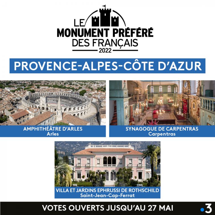 Les deux autres monuments en lice pour représenter la région Provence Alpes Côte d’Azur sont la synagogue de Carpentras et la villa et les jardins Ephrussi de Rothschild à Saint-Jean-Cap-Ferrat.