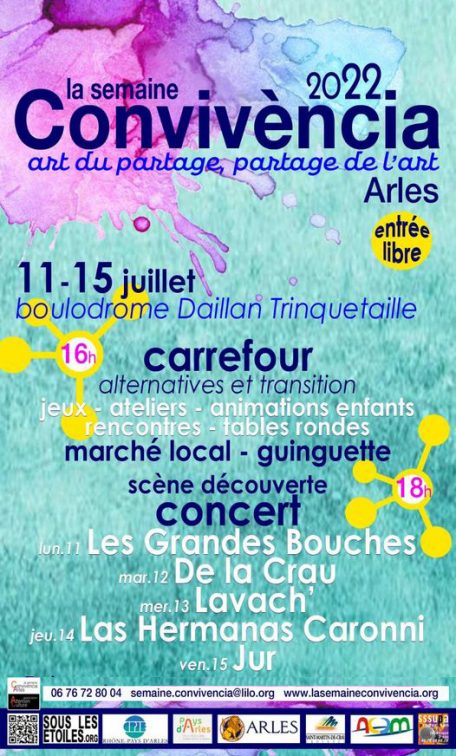 Des musiques du monde et des animations tournées vers le bien-être, la défense de l’environnement, le commerce équitable. La semaine de Convivència, du 11 au 16 juillet, cultive l’art du partage et le partage de l’art. A l’occasion de sa 20e édition, l’association Attention culture ! qui l’organise installe scène, ateliers, tables rondes, marché local et guinguette sous les platanes du boulodrome Daillan à Trinquetaille. La dernière journée, celle du samedi 16 juillet, prévue à Griffeuille en partenariat avec le Comité d’intérêt de quartier, est annulée. L’association Attention Culture, les bénévoles, les artistes, les représentants du CIQ agissent par solidarité avec la famille de Marwane, jeune homme victime de tirs par balles le 26 juin, et les habitants de Griffeuille.