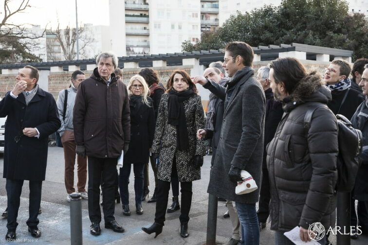 La directrice générale de l’Anru Anne-Claire Mialot, ici au centre aux côtés du maire d’Arles Patrick de Carolis, de l’adjointe au maire déléguée à l’urbanisme Sophie Aspord et de l’adjoint chargé de Barrio et vice-président à la politique de la Ville pour l’ACCM. Photo Rosalie Parent / Ville d’Arles