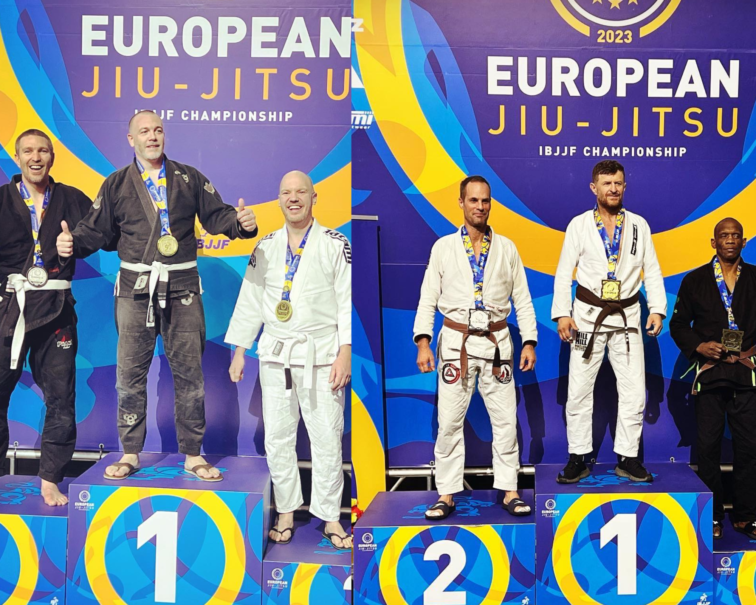 Cédric Cadour (à gauche sur le podium de gauche) et Olivier Thibaud (à gauche sur le podium de droite) ont été sacrés vice-champion d’Europe de ju-jitsu brésilien dans leurs catégories respectives. Photo DR