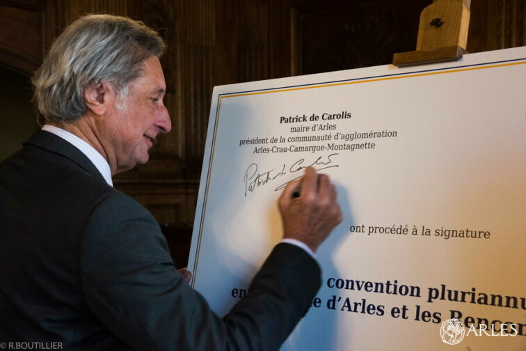 C’est dans la salle d’honneur de l’hôtel de ville d’Arles qu’était signée la première convention-cadre entre la Ville d’Arles et les organisateurs du festival, représentés par Patrick de Carolis, maire d’Arles, en présence de son adjointe à la culture Claire de Causans et Christoph Wiesner et Aurélie de Lanlay, respectivement directeur et directrice adjointe du festival. Cette convention fixe pour les quatre prochaines années les modalités de collaboration entre les deux acteurs, et en particulier les lieux et moyens mis à disposition et les engagements des deux parties.