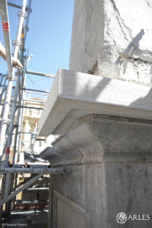 Il faut rappeler que c’est la chute d’une des pierres de la corniche, cet hiver, qui a précipité le déclenchement dans l’urgence de ces travaux programmés. Au terme d’une analyse de la pierre utilisée pour la construction de la corniche du socle et d’une minutieuse enquête, l’historienne de la société Architecture et Héritage (chargée de la maîtrise d’œuvre) a établi qu’elle provenait d’une carrière située à Arles, au niveau du quartier actuel de la Croisière. Aujourd’hui, c’est dans une carrière bourguignonne qu’une pierre présentant les mêmes caractéristiques a été identifiée. Acheminée à Arles, dans les locaux de l’entreprise Fernandez, elle a été découpée en blocs, eux-mêmes travaillés et taillés de telle sorte que l’eau de pluie ne s’écoule pas sur le monument une fois qu’ils seront en place. Les ouvriers de l’entreprise sont en train de poser chaque bloc un à un autour du socle. Ensuite, à partir du mois de septembre, ils s’attaqueront à la reprise d’étanchéité du bassin de la fontaine.