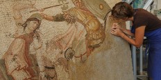 « Daphné », grande mosaïque du IIe ou du IIIe siècle, en provenance du Louvre, est arrivée cet été au musée départemental Arles antique pour restauration par l’équipe de Patrick Blanc. Le pavement initial, en plusieurs parties, constitué d’une scène centrale (une amazone en fuite) bordée par un décor géométrique, mesurait environ 6m sur 2,50m. Répertoriée sous le titre « Daphné amazonomachie », la mosaïque de sol a été découverte en 1934 à Antioche (Turquie), puis transportée [...]